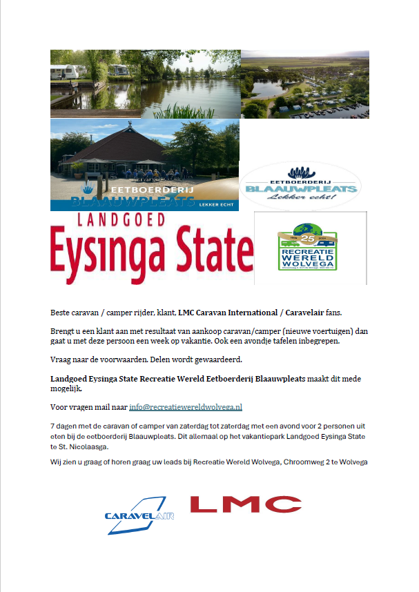 pak u kans weekje weg en 1 x uit eten met een nieuwe caravan of camper van Recreatie Wereld Wolvega. Bestel nu.